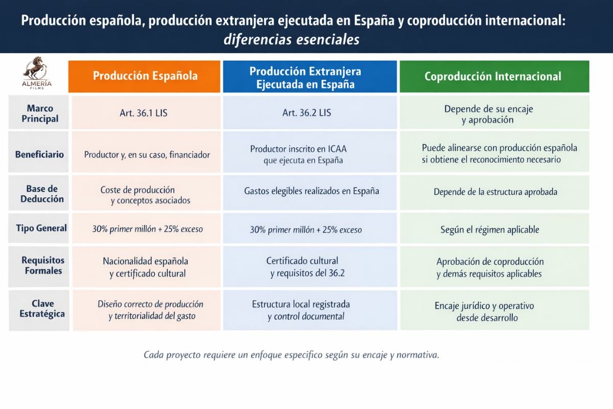 En el sector audiovisual se habla con frecuencia de "tax rebate" como si se tratara de un único mecanismo. Sin embargo, en España el marco no funciona como una fórmula única e indiferenciada. La normativa estatal distingue entre la deducción aplicable a producciones españolas y la deducción por gastos realizados en España en la ejecución de producciones extranjeras. A partir de esa base, las coproducciones internacionales deben analizarse según su encaje jurídico y administrativo, porque no operan como una categoría aislada al margen del sistema. Según la Agencia Tributaria, el artículo 36 de la Ley del Impuesto sobre Sociedades separa expresamente estos supuestos en apartados diferenciados.